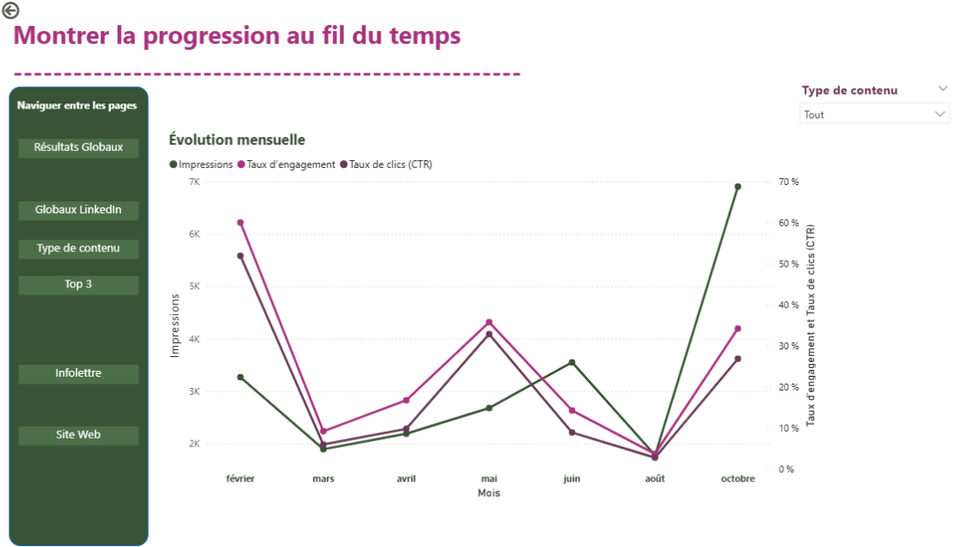 Le tableau de bord présente une vue globale avec le nombre total de publications, les impressions, les engagements ainsi que les taux moyens d’engagement et de clics. Il met également en valeur les contenus phares à travers un top 3 détaillant impressions, taux d’engagement et taux de clics. L’analyse par type de contenu permet de classer les performances en fonction de différentes métriques comme les clics, commentaires, impressions, mentions « j’aime » ou republications. Une section dédiée illustre l’évolution mensuelle des impressions, du taux d’engagement et du taux de clics, avec la possibilité de filtrer les données selon le type de contenu. La navigation est facilitée grâce à un menu latéral donnant accès aux sections clés, notamment les résultats globaux, le top 3, l’évolution, l’infolettre et le site web.
